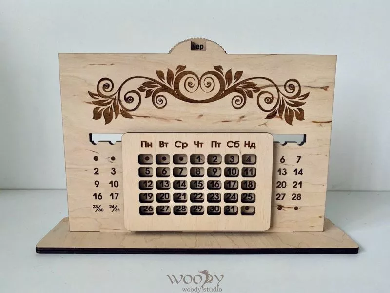 Вічний календар, зроблений з екологічно чистого матеріалу, може стати хорошим подарунком. Надійна, міцна конструкція довго прослужить своєму власникові. А для того, щоб додати йому унікальності, ми можемо вигравіювати на виробі будь-яку пам'ятний напис або зображення.